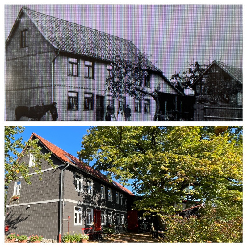 Auf dem Handy hatten wir eine App. Die hat das Kamerabild durchscheinend auf das alte Foto gelegt. So konnten wir den Standort des Fotografen vor 100 Jahren genau herausfinden.